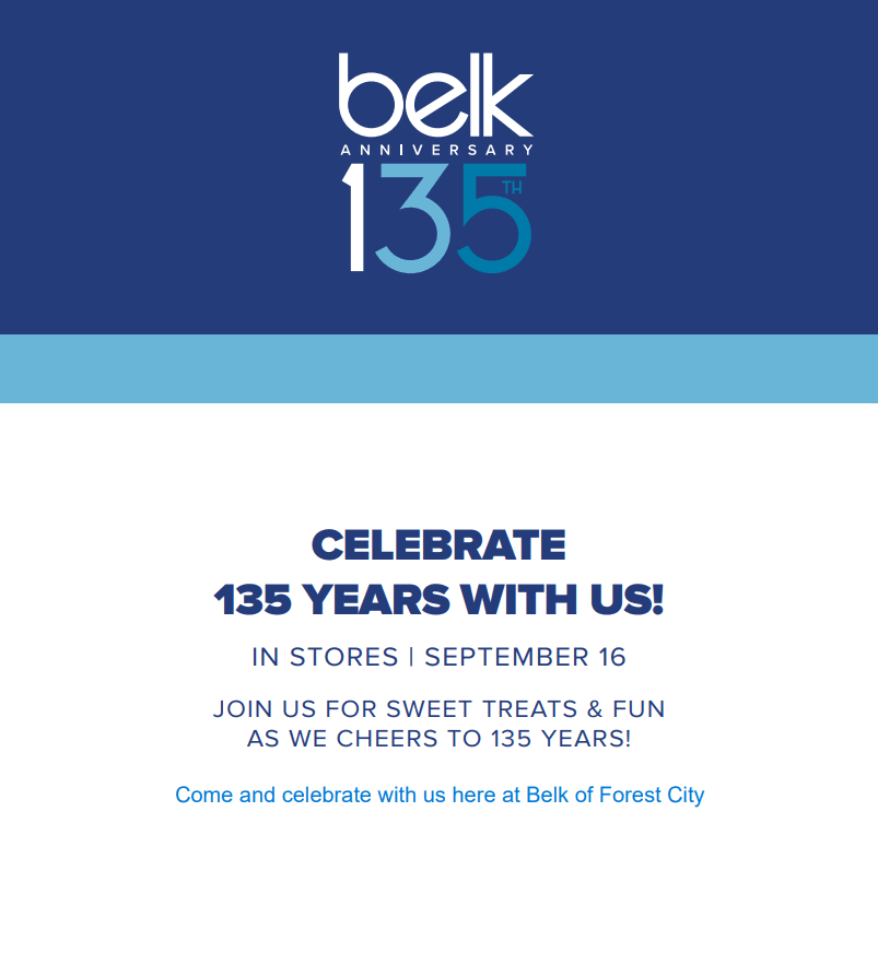 Celebrate 135 years with us! In stores September 16th Join us for sweet treats & fun as we cheer for 135 years! Come & Celebrate at Belk, Forest CityImages